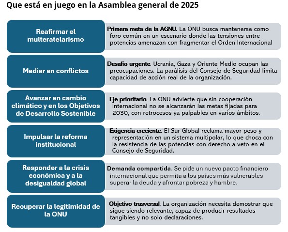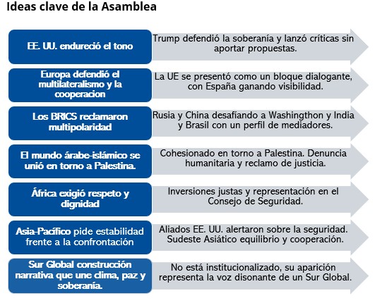 La Asamblea General, con presencia de líderes de todo el mundo, evidenció la creciente fractura entre Occidente, BRICS y el Sur Global. España defendió un multilateralismo activo, en un contexto de tensiones crecientes sobre seguridad, cambio climático y legitimidad institucional.