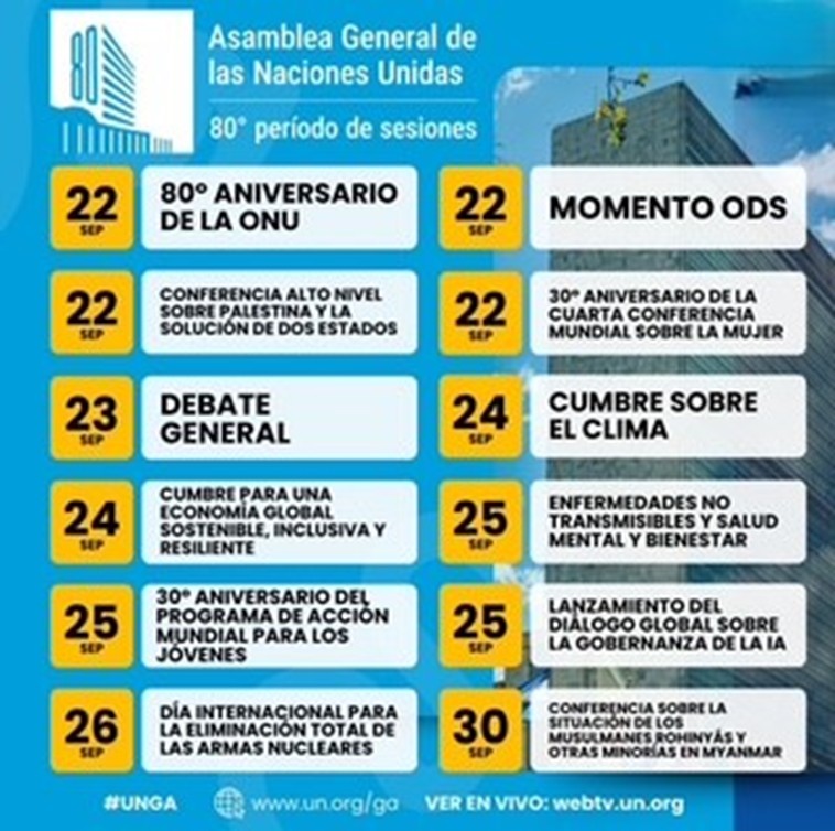 El 22 de septiembre se inauguró el período de alto nivel de la ONU bajo el lema “Mejor juntos: 80 años y más por la paz, el desarrollo y los derechos humanos”. La apertura estuvo marcada por un fuerte simbolismo: el 80º aniversario de la ONU, el Momento ODS, la Cumbre sobre Palestina y la solución de dos Estados y el 30º aniversario de la Conferencia Mundial sobre la Mujer de Pekín, que dieron inicio al Debate General y a una serie de cumbres sectoriales de impacto mundial.
