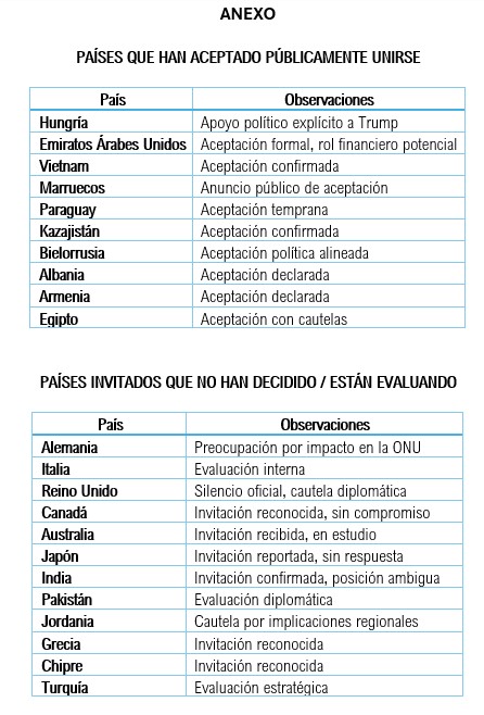 La mayoría de los países invitados permanece en una posición de cautela o espera. En general los países de Europa occidental muestran una clara reticencia, en contraste con países más alineados políticamente con Donald Trump o más dependientes de EE. UU, que parecen más dispuestos a participar en esta iniciativa, presentada como un organismo internacional alternativo.