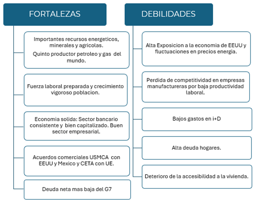 | CANADÁ | Impacto económico inmediato de aranceles estadounidenses. Resultados inciertos de las elecciones anticipadas. | Necesidad de diversificar los mercados de exportación. Ajustes en políticas migratorias y económicas. | Reconfiguración de relaciones comerciales internacionales. Desafíos demográficos (bajo crecimiento población). |