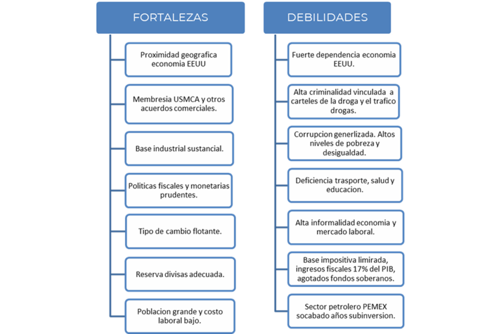 | MÉXICO | Impacto inmediato de aranceles en sectores clave. Aumento de tensiones sociales por violencia y derechos humanos. | Necesidad de diversificar socios comerciales. Reformas internas para abordar seguridad y economía. | Reconfiguración de la economía hacia nuevos mercados. Estabilidad política en función de gestión de crisis actuales. |