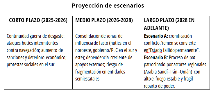 El Estado Islámico en Yemen (ISIS-Yemen), en cambio, se ha reducido a un actor residual, con células dispersas en Al-Bayda y ataques esporádicos de baja intensidad. Su principal fuerza es simbólica: la posibilidad de reactivar acciones terroristas si el vacío de poder se profundiza.